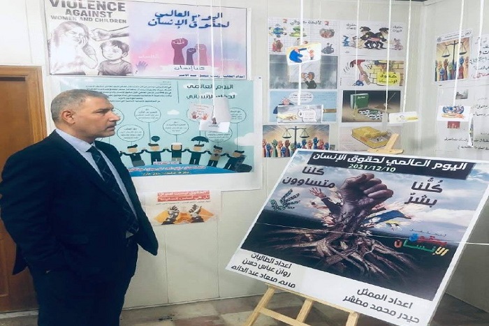 نظّمت وحدة "حقوق الإنسان" في "كليّة الإدارة الصناعيّة للنفط والغاز" معرضا تشكيليّا خاصا بحقوق الإنسان، تزامنا مع اليوم العالمي لحقوق الإنسان، وقد تضمّن هذا المعرض مشاركات تشكيليّة لعدد من طلّاب الأقسام العلميّة في الكليّة، توزّعت بين اللوحات الفنّيّة والخطّ العربي، فضلا عن التشكيل الفنّي الذي جمع بين الخطّ والرسم والنصوص المعبّرة عن المناسبة، إذ شارك السيّد عميد "كليّة الإدارة الصناعيّة للنفط والغاز" في هذا المعرض، كما شارك بعض أساتذة الكليّة وطلّابها، إذ دعا السيّد العميد إلى الاهتمام بهذه النشاطات التي من شأنها أن ترسّخ ثقافة حقوق الإنسان بشكل عام؛ وحقوق الأستاذ والموظّف والطالب بشكل خاص.