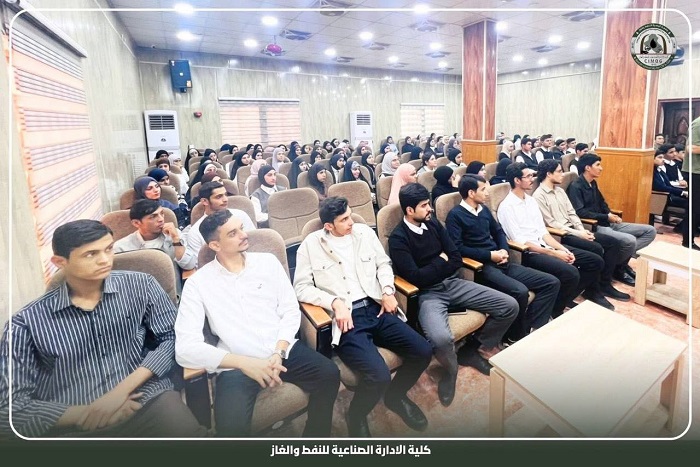The Dean of the College of Industrial Management for Oil and Gas, Professor Dr. Sami Obaid Mohammed Al-Tamimi, met with the first-stage students, accompanied by the Head of the Department of Oil and Gas Economics, Dr. Adnan Hadi Jaaz, and the Head of the Department of Oil Accounting, Dr. Sajad Al-Haid. The college's large conference hall included all students from the first-stage scientific departments, and the meeting with them was during official working hours yesterday, Sunday (November 23, 2025). The Dean of the College welcomed them, congratulated them on the beginning of their academic journey in the departments of the College of Industrial Management for Oil and Gas, and urged them to continue their studies with diligence and perseverance for a bright future.